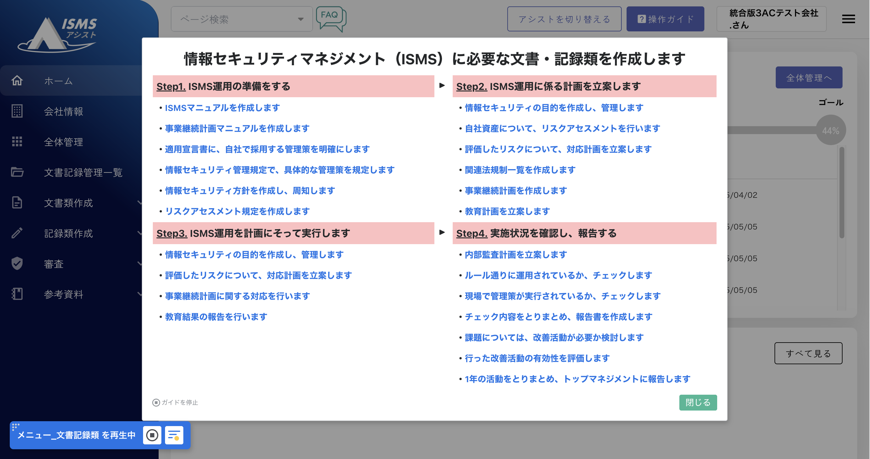 日々の運用から審査対応に至るまで、手順通りに進めていくだけで迷わずタスクを実行できます。困ったときのサポート機能も充実。