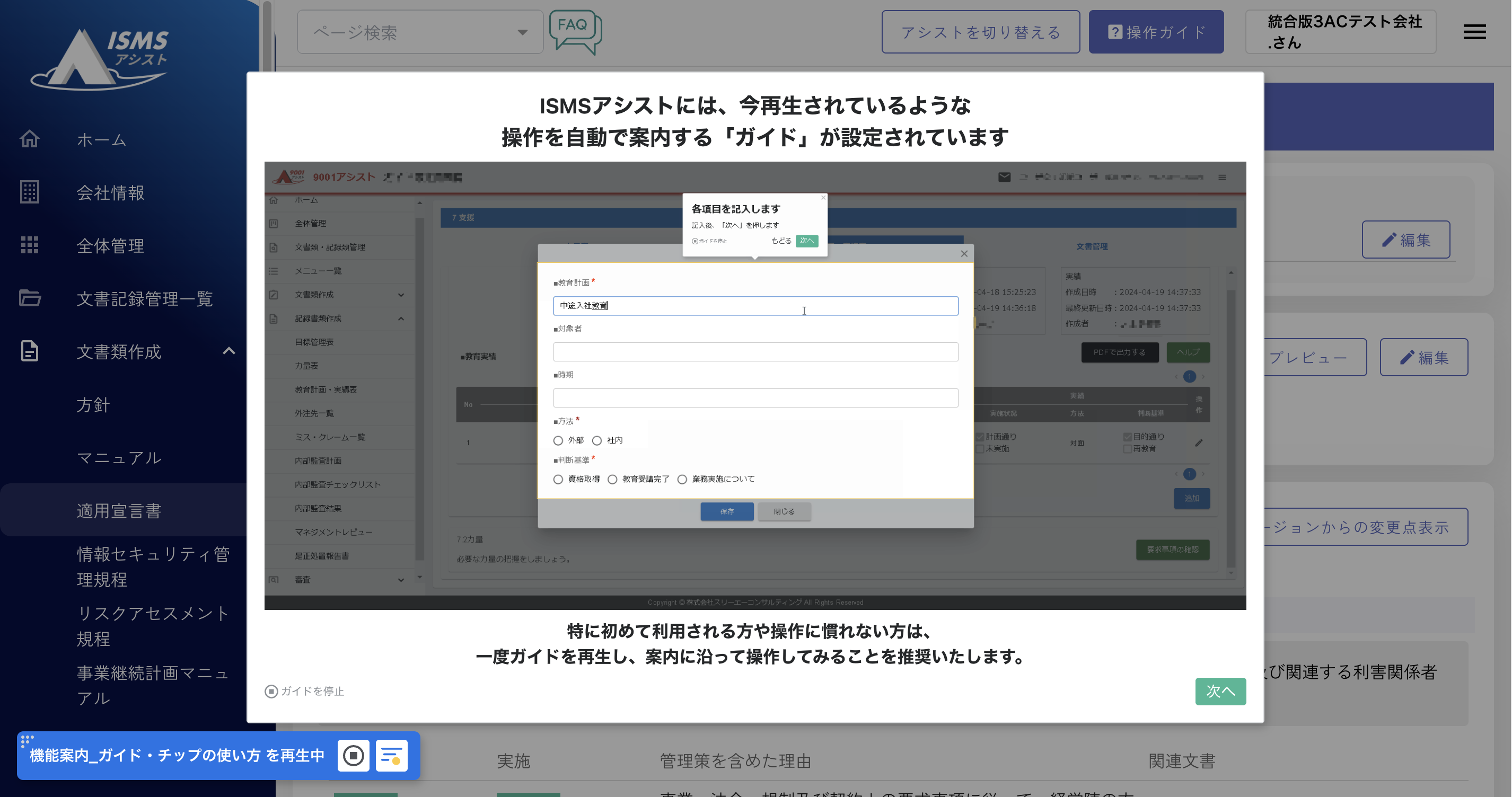 タスクの入力画面上ごとに、規格の要求事項とわかりやすい説明が記載されたドキュメントやWebページと連動。初心者向けのチュートリアルやQ&Aも豊富に搭載。