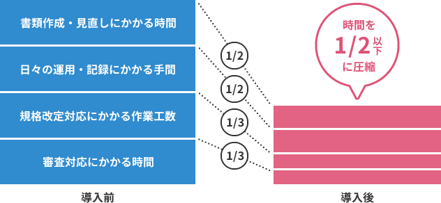ISMSアシストの導入で、はじめてのISMS取得時はもちろん、取得後の定期的な運用もスムーズ化されます。文書などの見直し・管理にかかる時間や、維持審査や更新審査にかかる負担を半分に圧縮することも可能。その分、本来の重要な業務を優先できるようになります。